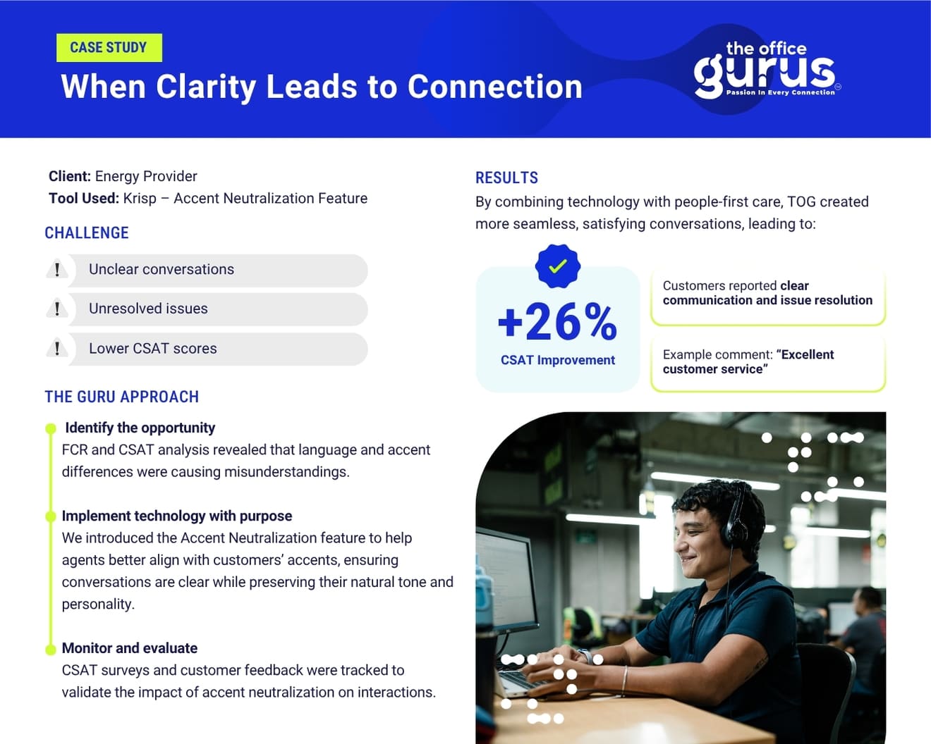 In today’s global contact centers, clear communication is essential for building trust and delivering exceptional customer experiences. For one of The Office Gurus’ energy provider clients, accent differences were creating barriers to understanding, resulting in unclear conversations, unresolved issues, and declining CSAT scores. To bridge this gap, TOG implemented Krisp’s AI-powered Accent Neutralization feature, aligning advanced technology with our people-first BPO approach.