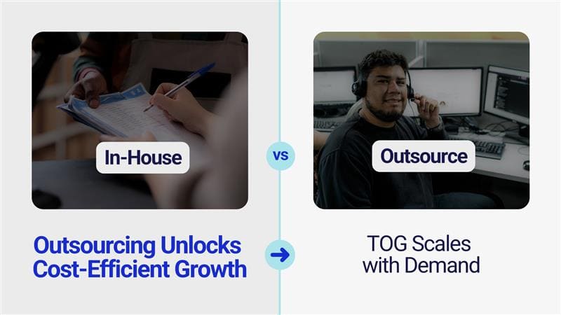 Outsourcing is one of the most effective ways to strengthen scalability. With TOG, businesses gain a flexible extension of their team capable of ramping quickly, maintaining quality, and supporting revenue-driving interactions.