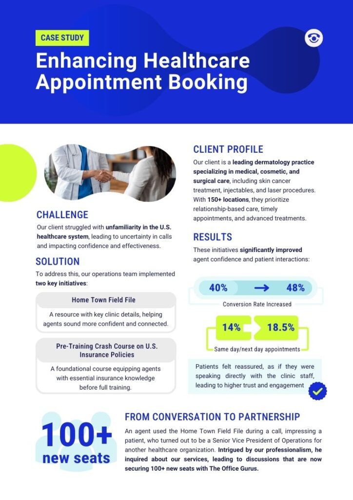 One of our clients is a leading dermatology practice specializing in medical, cosmetic, and surgical care, including skin cancer treatment, injectables, and laser procedures. This company struggled with unfamiliarity in the U.S. healthcare system, leading to uncertainty in calls and impacting confidence and effectiveness.