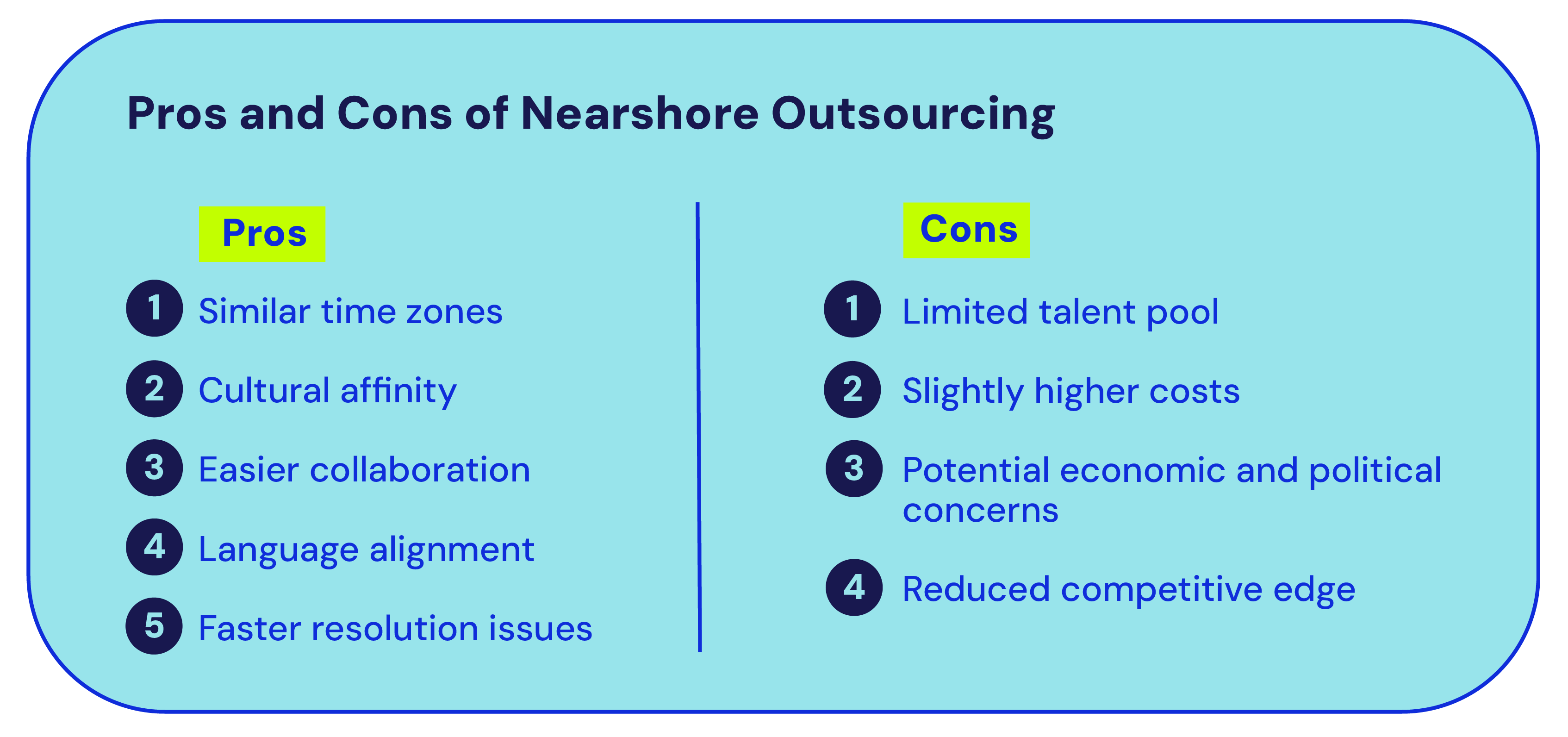 One of the main benefits of nearshore outsourcing is cost-effectiveness. Companies can access highly skilled professionals at a lower cost than hiring local talent. Additionally, nearshore outsourcing allows quicker turnaround times and reduced travel expenses, as visiting the outsourcing partner is more convenient.
