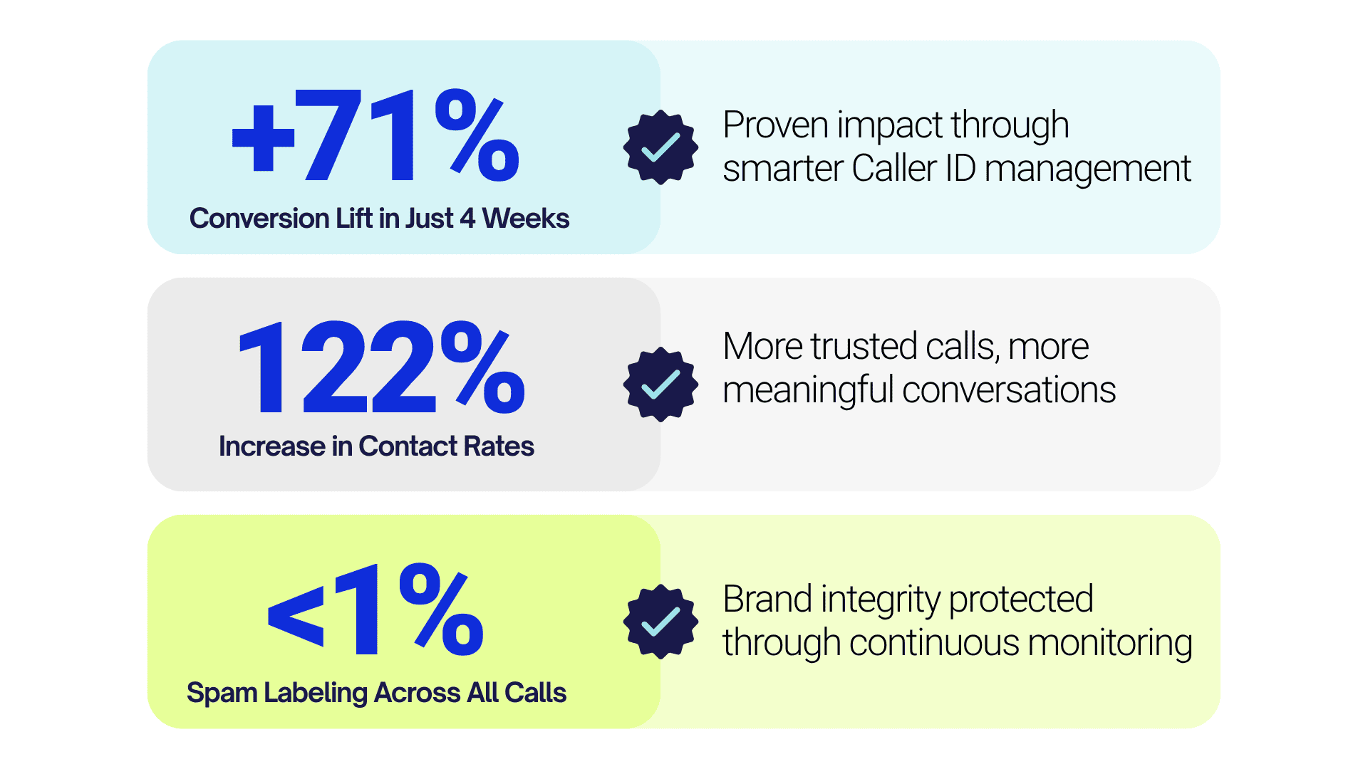 When your calls are trusted, your conversations are more productive. Companies using our solutions routinely see double-digit increases in contact and conversion rates, demonstrating the direct link between caller ID accuracy and campaign performance.