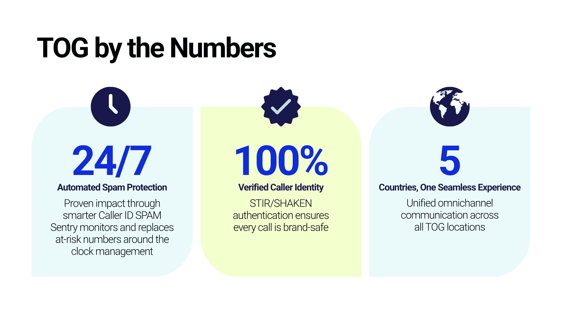 Impersonation and spam tagging can severely damage your reputation. TOG’s Branded Calling ID and PureCallerID technology combine carrier verification and ongoing monitoring to safeguard your numbers and ensure consistent visibility.