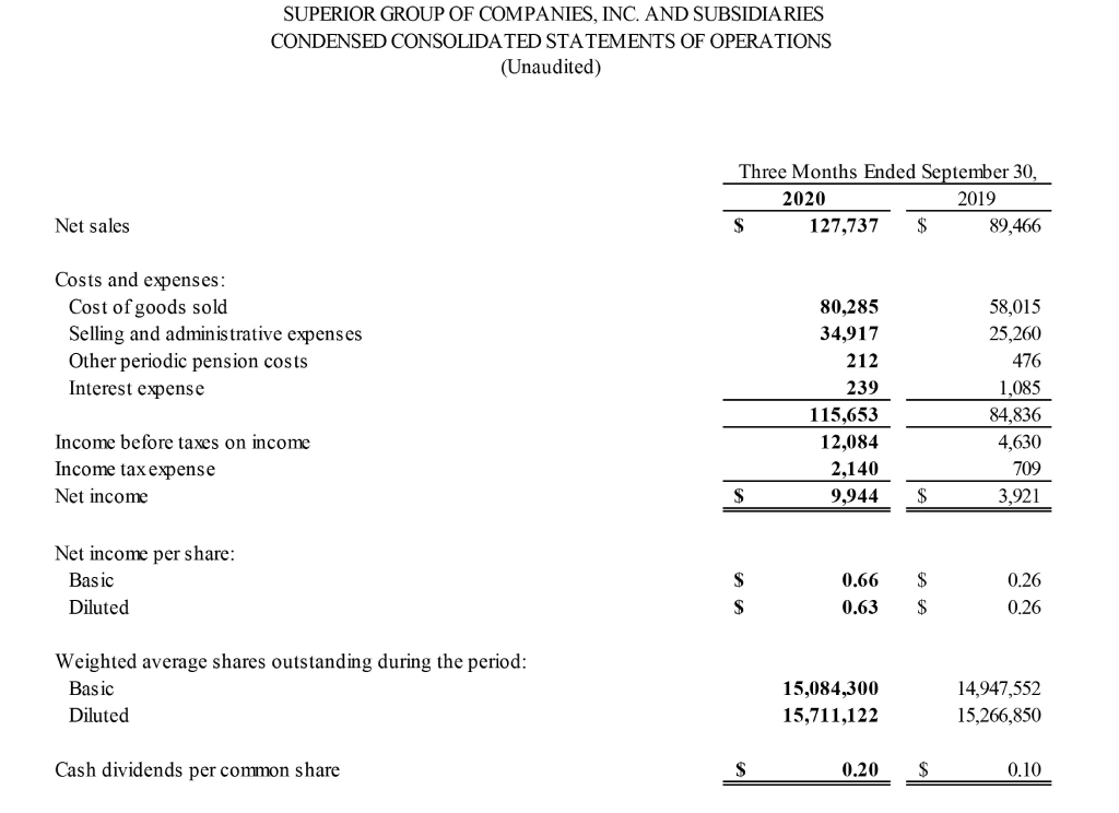 SEMINOLE, Fla. – October 29, 2020 – Superior Group of Companies, Inc. (NASDAQ: SGC), today announced its third quarter operating results for 2020.