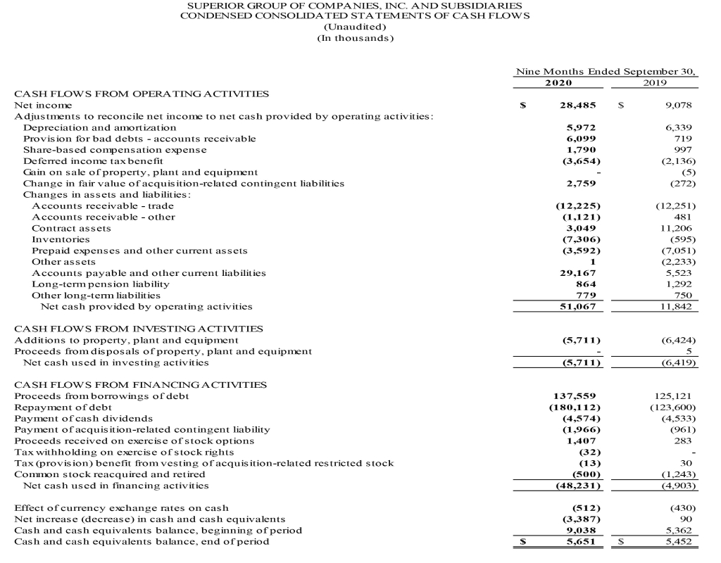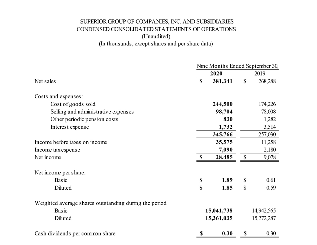 SUPERIOR GROUP OF COMPANIES, INC. REPORTS OPERATING RESULTS FOR THE THIRD QUARTER ENDED SEPTEMBER 30, 2020