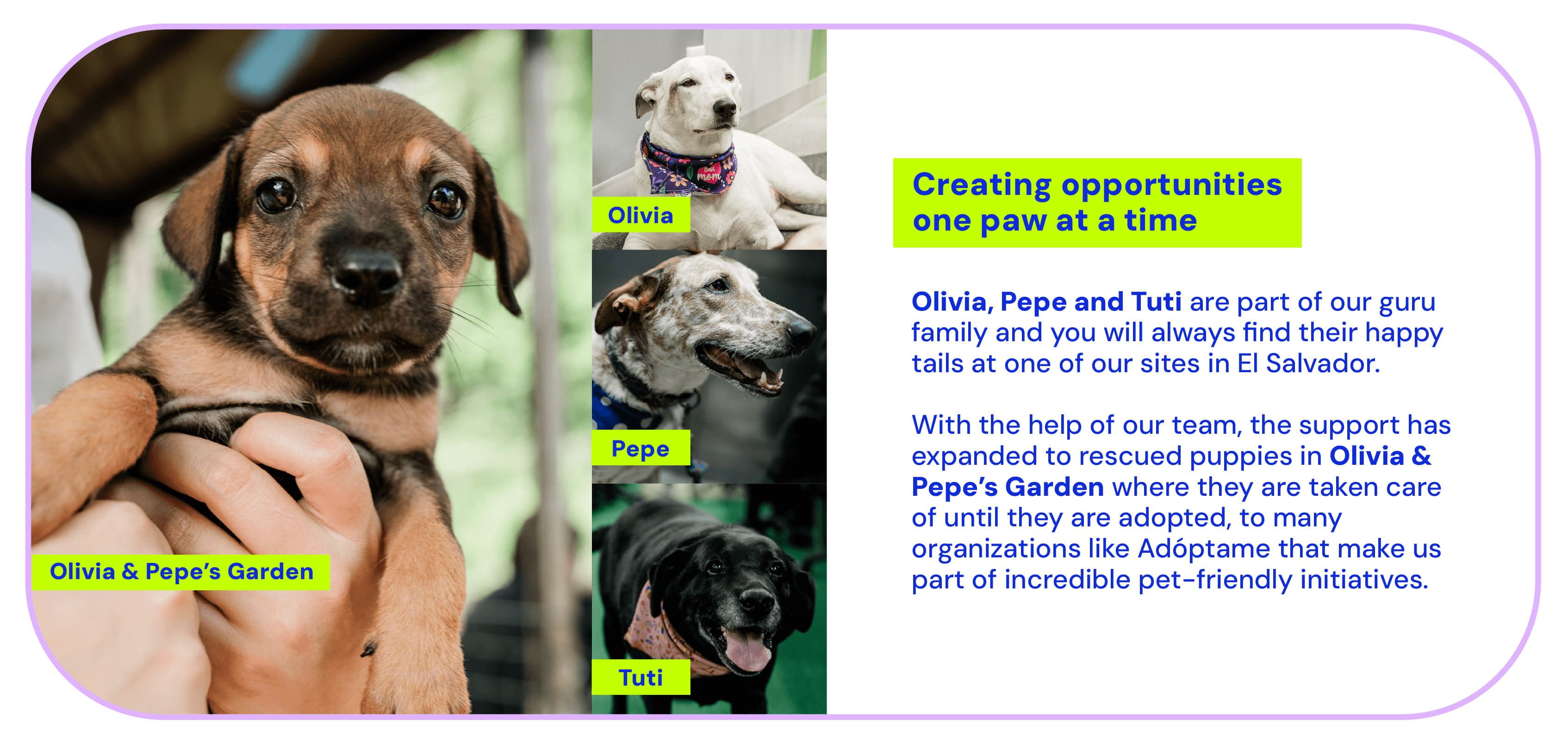 Through the Pawsitive Friends program, we actively encourage adoption, even within our team. Many of our recent furry friends have found their forever homes with our dedicated Gurus, but the work doesn’t stop there. Olivia and Pepe, two beloved rescued dogs adopted in 2017 and 2020, respectively, have become cherished members of our family, alongside Tuti. They inspire us to continue welcoming more dogs into Oli’s Garden, a nurturing space where our team provides temporary care until each dog is ready to join a loving family.